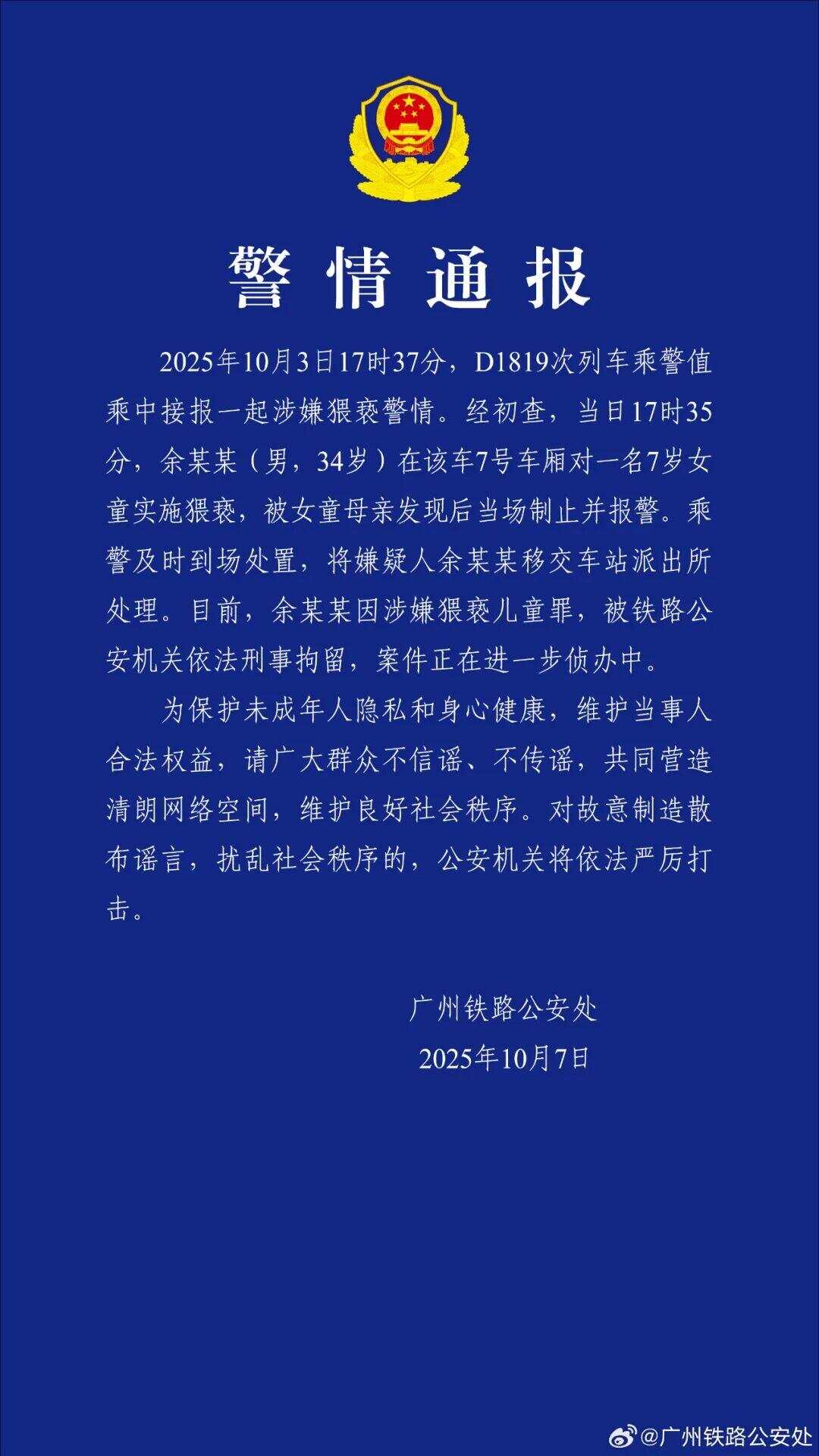 10月7日,广州铁路公安部门发布警方通报:2025年10月3日17时35分,D1819次列车上,一名34岁男子猥亵一名7岁女童。女孩的母亲发现了她,并在这个地方停下来。人限于孩子起义的嫌疑。以下为报道全文: 2025年10月3日17时37分,D1819次列车民警在执勤期间接到疑似事件报告。经初步调查发现,当日17时35分,于某某(男,34岁)在7号车厢内安抚一名7岁女童。女孩的母亲发现了这件事,将她从现场拦了下来,并报了警。民警立即赶到现场,将犯罪嫌疑人余某某移送派出所处理。目前,于某某因涉嫌儿童暴动罪已被铁路刑事公安局依法刑事拘留。目前案件正在进一步审理中。为保护未成年人隐私和身心健康,维护当事人合法权益,请广大公众不信谣、不传谣,共同营造清朗的网络空间,维护良好的社会秩序。对故意散布谣言、扰乱社会秩序的,公安机关将依法严肃查处。来源 |羊城晚报、羊城学校、金羊网记者|严敏