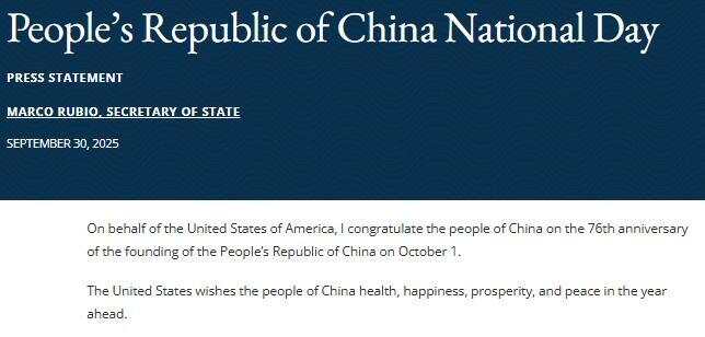 根据美国国务院在当地时间的9月30日,美国国务院网站的10月1日,美国国务卿卢比奥发表了一份简短声明:代表美利坚合众国,我要祝贺中国人民共和国成立76周年。图像来源:美国国务院官方卢比奥网站的屏幕截图表示,美国希望中国的健康,幸福,繁荣和团结。较早的报告于2024年10月2日,国务卿发表了一份声明,祝贺中国人民共和国成立75周年。他在当时的声明中说:“当美国与国际社会合作应对当今世界面临的严重障碍时,我们专注于负责管理与中华人民共和国的双边关系和维持托管沟通渠道的负责任。”中国人的和平,繁荣与幸福。