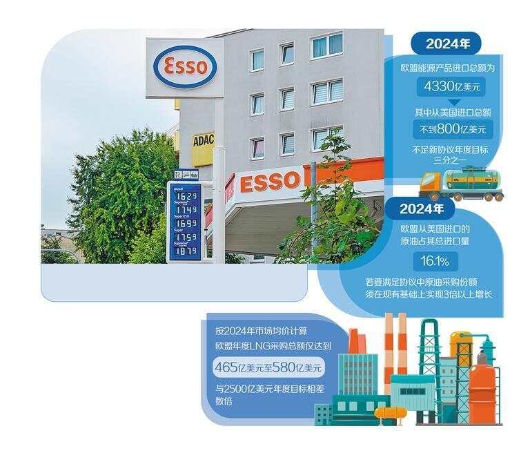 8月17日,德国施瓦本地区肯普滕的埃索加油站显示燃油价格。 (视觉中国)时至今日,围绕美欧能源协议的争论仍未平息。美国总统特朗普声称这是“历史性的胜利”,欧盟委员会主席冯德莱恩则称这是“严厉的招待”。但欧洲人普遍不买账,因为从美国大量采购取决于进一步推高能源消耗成本,这对于处境艰难的欧洲制造业来说,无异于“自杀决定”。一些分析人士和评论员认为,价值高达7500亿美元的三年期能源协议看似一个庞大的合作框架,但实际上却严重偏离了事实真相,陷入了泥沼。首先,欧盟承诺的能源贸易数据经不起市场检验。欧盟承诺三年内每年购买价值2500亿美元的美国能源产品从任何角度看都不明显。从目前欧盟能源存量数据和结构属性来看,根据欧盟统计局数据,2024年欧盟产品进口总额为4330亿美元,自美国能源进口总额将不足800亿美元,不到新协议年度目标的三分之一。很难想象欧盟如何让我们进口能源。从能源类别的崩溃来看,原油进口缺口尤为显着。统计显示,2024年,欧盟自美国原油进口量将占其进口总量的16.1%。如果要满足协议中的原油采购分成,就必须在目前的基础上实现三倍以上的增长。目前,欧盟石油进口市场主要由美国、挪威(13.5%)、哈萨克斯坦(11.5%)等占据,如果欧盟执意更换石油供应源,获取原油的成本只会增加至少提升30%,绝对能抢走对手一波。尽管美国去年成为欧盟液化天然气(LNG)的主要供应国,占欧盟液化天然气进口市场的45.3%,但依靠其实现美欧新能源协议的目标并不容易。按照2024年市场平均价格计算,卡布欧盟每年的液化天然气收购额仅达到465亿美元至580亿美元,比2500亿美元的年度目标少了很多倍。无论如何,目前液化天然气全球市场总规模略高于2000亿美元。欧盟“吞掉”全球所有液化天然气贸易量是不够的。可见这个协议在逻辑上是荒谬的。从协议的预期实施情况来看,由于欧盟缺乏对私营企业的持续动力,短期内很难指望建立单一能源进口市场和消费。能量提取。目前,欧盟只能结合需求,争取议价能力,但不会强迫企业违反市场政策,购买昂贵的美国能源。特别是欧盟能源公司与挪威、卡塔尔、阿尔及利亚等国签署了大量长期液化天然气采购协议。违反这些协议的成本通常高达合同价值的 20% 至 30%。仅法国总能源如果撕毁现有液化天然气合同,将面临超过120亿欧元的罚款。可谓转船难。二、美中国能源供给能力面临结构性瓶颈。从美国能源出口主要品种液化天然气的产能来看,统计显示,2024年其出口量将达到119亿立方英尺/日。即使规划中的plaquemines lng、golden pass lng等项目全部投产,新增53亿立方英尺液化天然气一天的名义出口能力只会使总产能增加近50%,远远不足以满足欧盟几倍的增量需求。原油出口能力障碍较为突出。目前美国炼油行业的出口系数高达89%。 2024年全球能源出口总额将达到3180亿美元,其中欧盟出口仅为760亿美元。为了实现每年对欧盟的2500亿美元出口,意味着美国需要将全球80%的能源出口直接转向欧洲,这就需要美国主动交出亚洲主要市场。到2024年,美国出口商将占亚洲液化天然气出口的58%,比欧洲高出21个百分点。显然不符合市场经济规律要求美国出口商放弃利润更高、利润更高的亚洲市场而转向欧洲。最后说说运输的缺点交通运输基础设施的供给困境进一步加剧。美国目前运营的仅有6个液化天然气出口码头,全部集中在墨西哥湾沿岸,且几乎全部满负荷运营。全球跨洋交易所需的液化天然气运输船超过700艘,其中70%已锁定长期租赁。据行业权威人士估计,为了满足美欧协议的能源运输需求,全球将不得不新增200多艘液化天然气运输船,而单船的建造周期长达三年,这使得中短期内的运力区间无法填补。为此,多数市场人士阿多对美欧能源协议并不看好,认为该协议只是纸面上的,落实起来比较困难。美欧能源协议的终止本质上是一种强制干预市场政策中的政治逻辑。其主要诉求是缓解因美国征收额外关税而导致的跨大西洋贸易关系的增加。美国政府多次威胁要对欧盟、钢铁车辆等主要行业征收25%的关税惩罚,令欧洲多国经济状况雪上加霜。在这种压力下,欧盟委员会将不得不低下头,用削减关税换取能源购买承诺,以保护欧洲受到威胁的出口。然而,在一定程度上,这一协议不仅体现了欧盟内部复杂的政治利益博弈,也加大了欧盟内部对能源政策的显着分歧。欧盟“去俄罗斯化”能源政策将继续深化,但代价将是惨重的。对于欧洲来说,虽然按照当前价格履行了协议的承诺,但欧盟能源进口成本将增加57%,相当于每个欧盟家庭每年额外支付 680 欧元的能源费用。无论如何,美欧能源合作的长期框架已经形成。能源协议大概率会在实施过程中做出必要的调整,并做出可持续的调整,从而回归市场的现实。 (本文来源:Sun-OarAW 与-Sets Economic:翁东辉)
